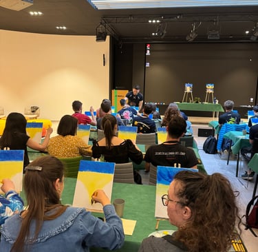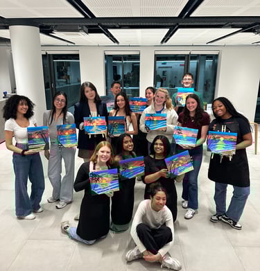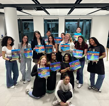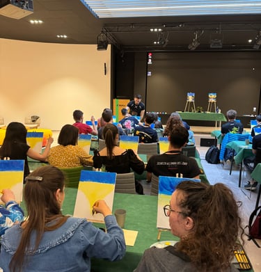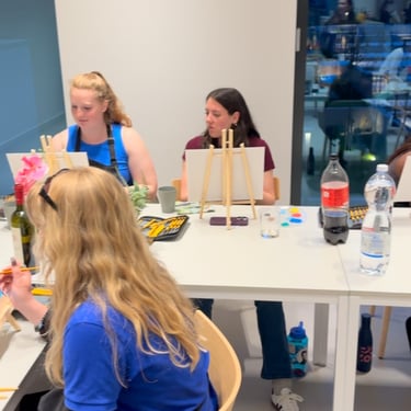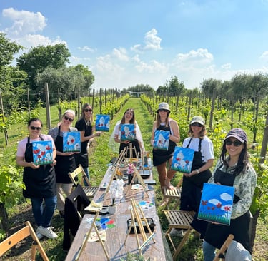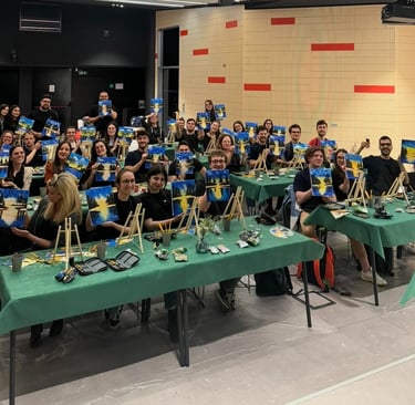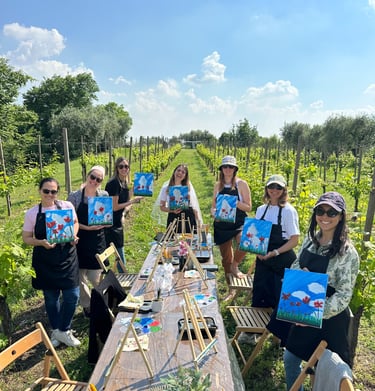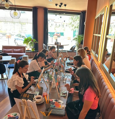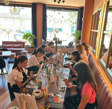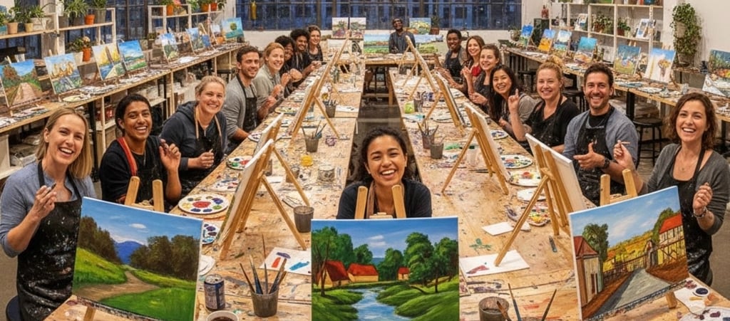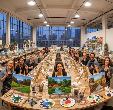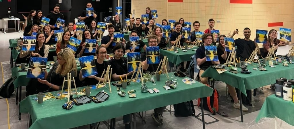 Un laboratorio artistico dove ogni partecipante dipinge la propria tela, guidato passo dopo passo da un insegnante.